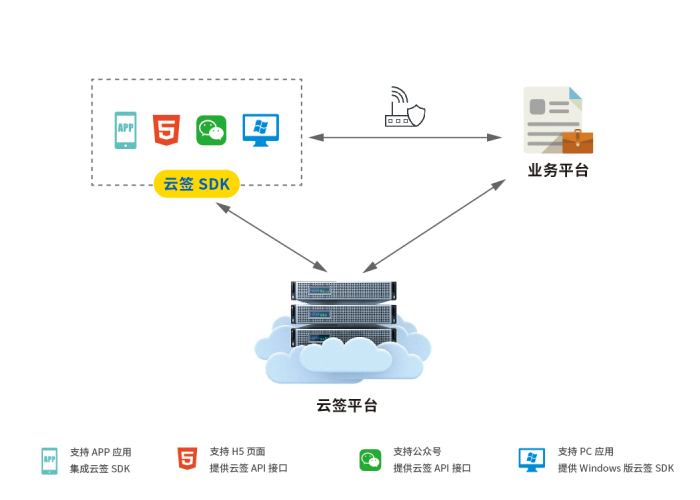 • 雲簽名服務系統采用(yòng)雲端托管私鑰和(hé)密鑰拆分(fēn)技(jì)術(shù),将用(yòng)戶簽名密鑰托管到(dào♣)雲簽服務端,提供雲簽服務,實現(xiàn)待簽文(wén)件(jiàn)展示、活體(tǐ)認證、手寫簽字采集、文(wénα)件(jiàn)簽章(zhāng)功能(néng),支持APP、PC、H5、微(wēi)信小(xiǎo)程序、微(wēi)信公衆号等多(duō)種應用(y≥òng)場(chǎng)景。